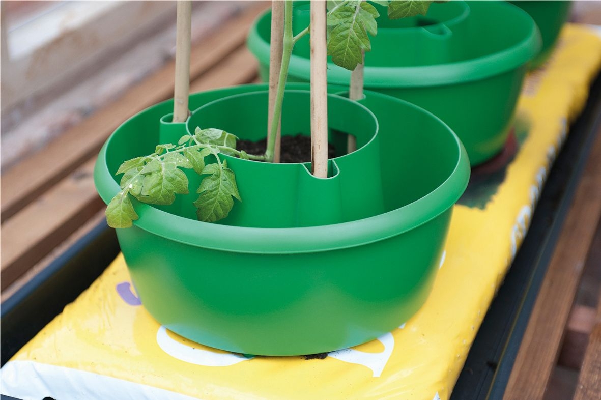 Наши новые уникальные Plant Halos - это решение "все в одном" для полива и поддержки урожая таких популярных культур, как томаты, перец и фасоль. Продаваемые в наборах по 3 штуки, Plant Halos могут использоваться в мешках для выращивания, горшках (диаметром 26 см и более), приподнятых грядках, а также на традиционных овощных участках. Центральная часть создает посадочную зону, что особенно полезно при использовании мешков для выращивания, так как позволяет углубить посадочную зону для развития более здоровых растений. Внешний "ров" объемом 3,1 литра оснащен шестью поливочными шипами, которые проникают под поверхность на 2,8 см, доставляя воду непосредственно к корням растений. Благодаря этому вода и жидкая подкормка подаются с меньшей скоростью, которую растение лучше усваивает, предотвращая потери, характерные для обычного полива. Обычно на полный слив воды из резервуара уходит от 3 до 6 часов, в зависимости от погоды и состояния почвы. Plant Halos также оснащены уникальной системой поддержки. 3 анкерных паза окружают внутренний горшок и обеспечивают жесткую, устойчивую к ветру конструкцию с использованием бамбуковой или другой поддержки (не входит в комплект). В комплект входит крепёж для поддержки, который позволяет соединить до 4 опор на вершине получившейся конструкции. Крепёж для опор аккуратно отделяется пользователем от основного изделия. Plant Halos изготавливаются из переработанного пластика, стабилизированного ультрафиолетовым излучением.